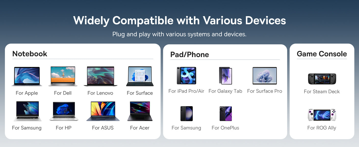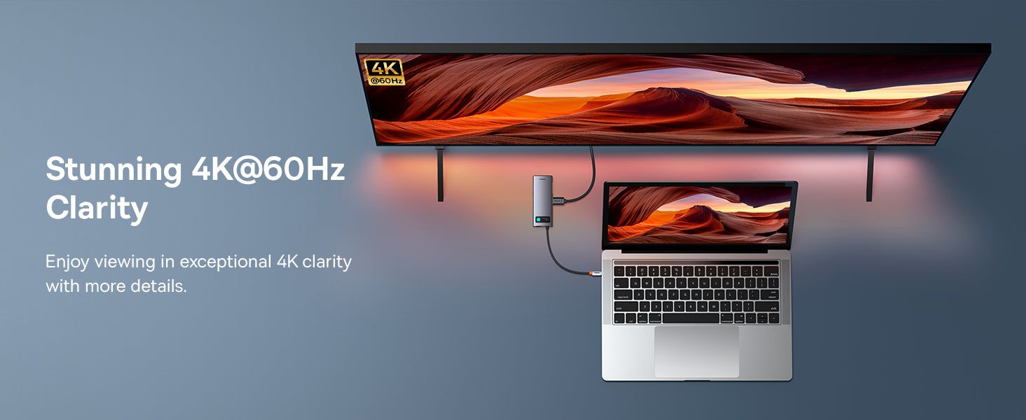 با استفاده از پورت HDMI هاب باسئوس، میتوانید لپتاپ یا گوشی خود را به مانیتور یا تلویزیون متصل کرده و از تجربهای بینظیر با کیفیت تصویر فوقالعاده بهرهمند شوید. این ویژگی به شما اجازه میدهد تصاویر و ویدیوها را با وضوح 4K مشاهده کنید.