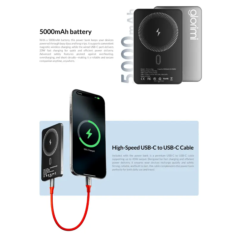 پاوربانک وایرلس 5000mAh گلوریمی یکی از جدیدترین و کاربردیترین محصولات برند Glorimi در دسته لوازم جانبی هوشمند است که با تمرکز بر طراحی باریک، وزن سبک و پشتیبانی از شارژ بیسیم مغناطیسی (Magnetic Wireless Charging) تولید شده است. مدل Glorimi FitCore Mag با توان خروجی حداکثر 20 وات، پاسخگوی نیاز کاربران مبتدی تا حرفهای بوده و گزینهای ایدهآل برای استفاده روزمره، سفر و محیط کار به شمار میرود. این پاوربانک با ظرفیت اسمی 5000 میلیآمپر ساعت، در کنار پشتیبانی از شارژ وایرلس و درگاه USB-C، تجربهای سریع، ایمن و بدون دردسر از شارژ دستگاههای دیجیتال را برای شما فراهم میکند.