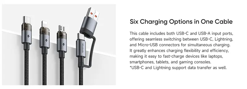 این کابل با پشتیبانی از توان 100 وات، برخورداری از سه خروجی پرکاربرد (Type-C، Lightning و Micro USB) و قابلیت استفاده در 6 حالت مختلف شارژ، یکی از کاملترین کابلهای چندکاره بازار محسوب میشود.